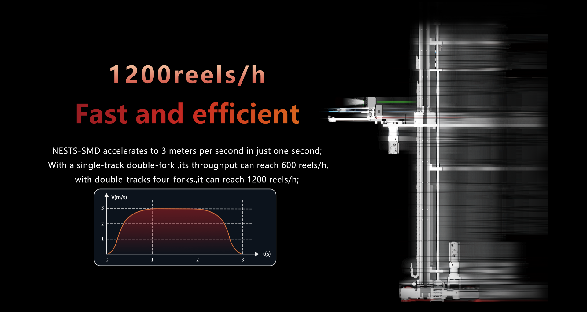 automatic palletizing, automatic docking, automatic buffering, buffer capacity: 80 reels (7" 8mm reel)